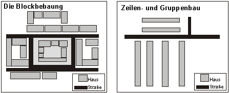 Neben dem Blocksystem etablierte sich die sogenannte Zeilenbebauung: Diese seit etwa 1930 eingeführte Systematik stellt die Häuser parallel zur Himmelsrichtung. Wenn sie rechtwinklig zur Straße stehen, läuft der Verkehr nur an der Stirnseite mit geringstmöglicher Störung vorbei. Die schmalen Häuser enthalten meist durchgehende Wohnungen, die nach beiden Seiten mit Fenstern ausgestattet sind. Einfachzeilen, Doppelzeilen, Staffelung etc. entstehen als Bebauungskonzept für Siedlungen. Die Formung der Freiräume durch Baugruppen wird in der 2. Hälfte des 20. Jh. zu einem wichtigem Prinzip im Städtebau. Es soll eine Stadtlandschaft entstehen; die Baugrößen und Formen werden konsequenter gestaltet und die Bedeutung des Lebensraumes "Stadt" wird wieder neu entdeckt. Leider ist bis heute eine Investorenkultur entstanden, d. h. Geld und Politik bestimmen häufig die Abläufe.