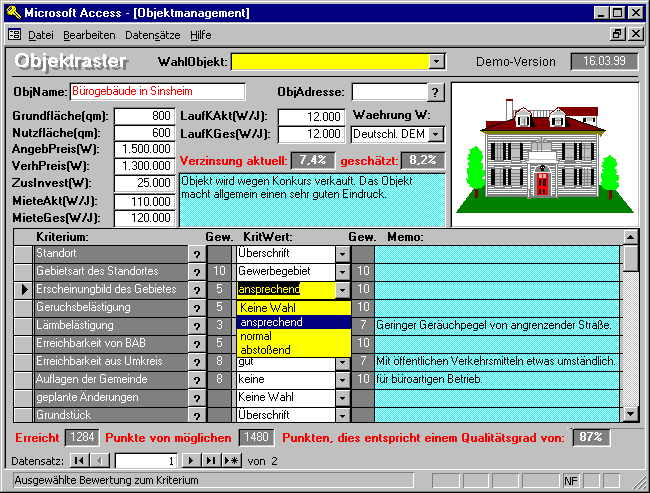 aufgenommen werden. Bitte beachten wir vermitteln lediglich diese Softwarelösung und leiten Ihre Anfrage an Optima Software weiter. Wir bieten eine indivduelle Konfiguration, abgestimmte Kriterien zum Programm und vieles mehr.Im Rahmen Ihrer Anfrage teilen wir Ihnen unsere Preis mit. DrOja++ Bewertung baulicher Objekte Die Demoversion 20,88 Euro (=18 Euro netto) und die Vollversion 220,40 Euro (=190 Euro netto) als Einzelplatzvariante. Ab Win95/Nt40 und Access 97/2001, Access wird für die Ausführung benötigt. Demos sind lauffähige und einsatzfähige Originale, die in der Regel nur im Speicherungsumfang begrenzt sind. (Versandkosten inklusive bei der Software). Geliefert wird auf CD.